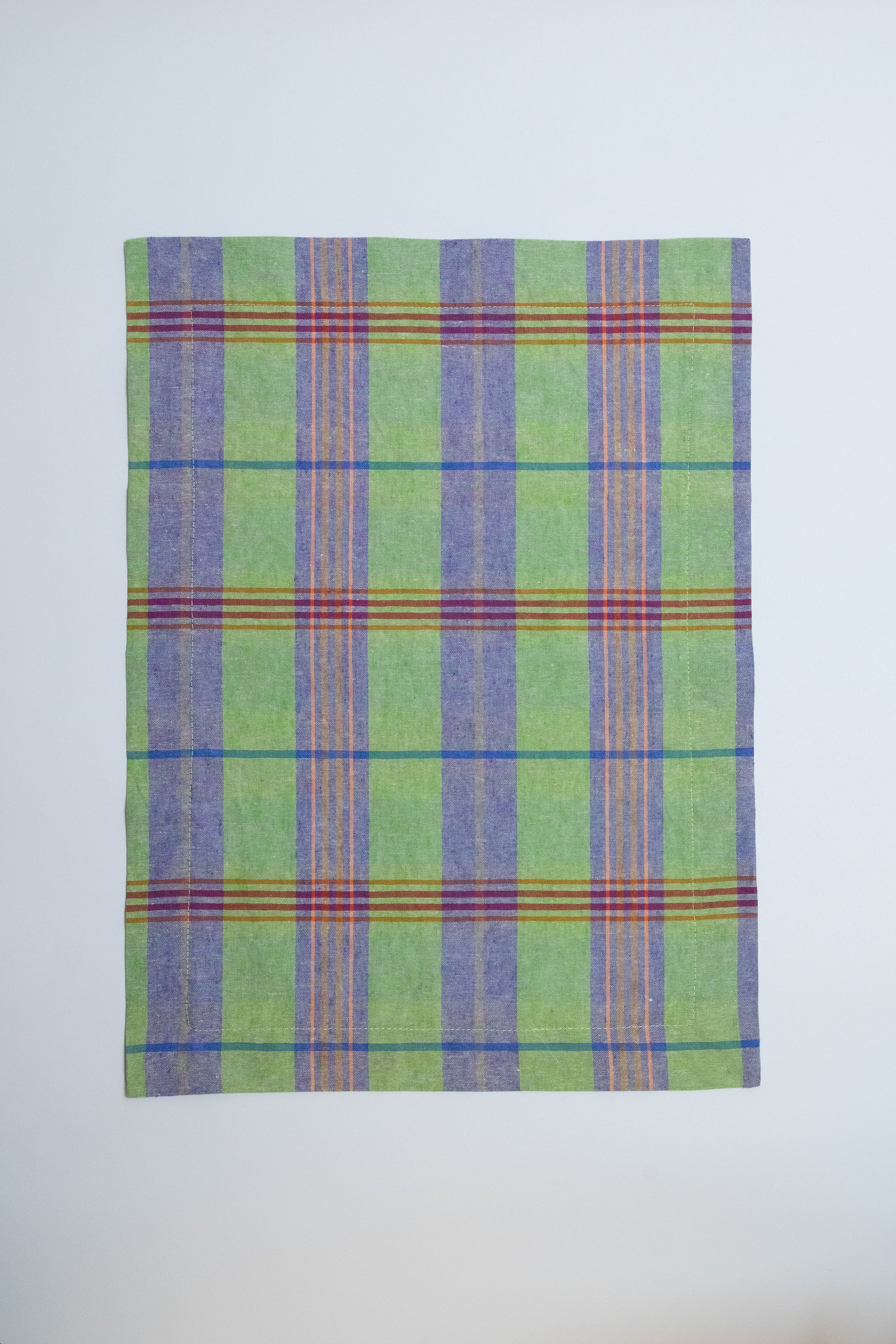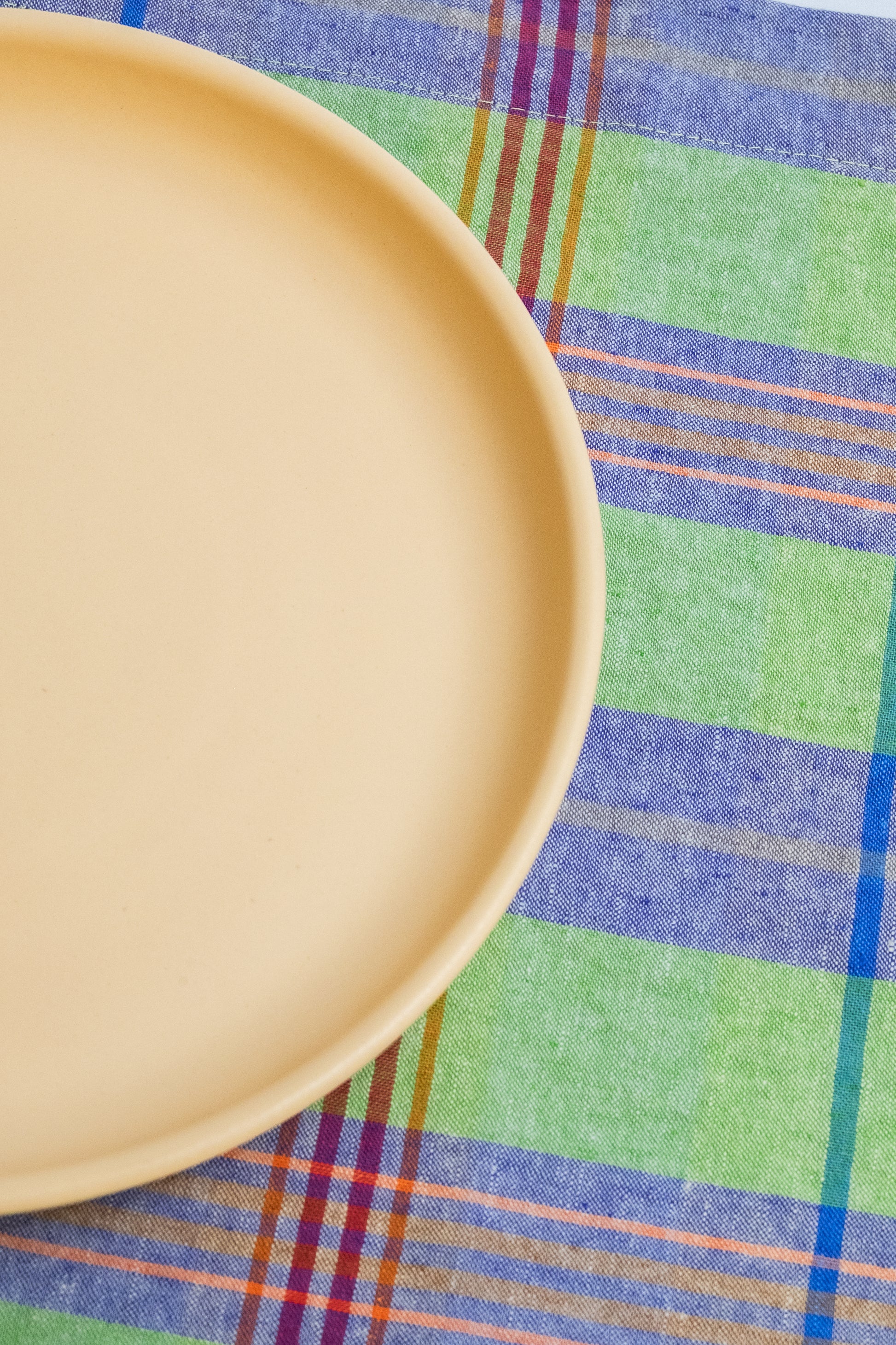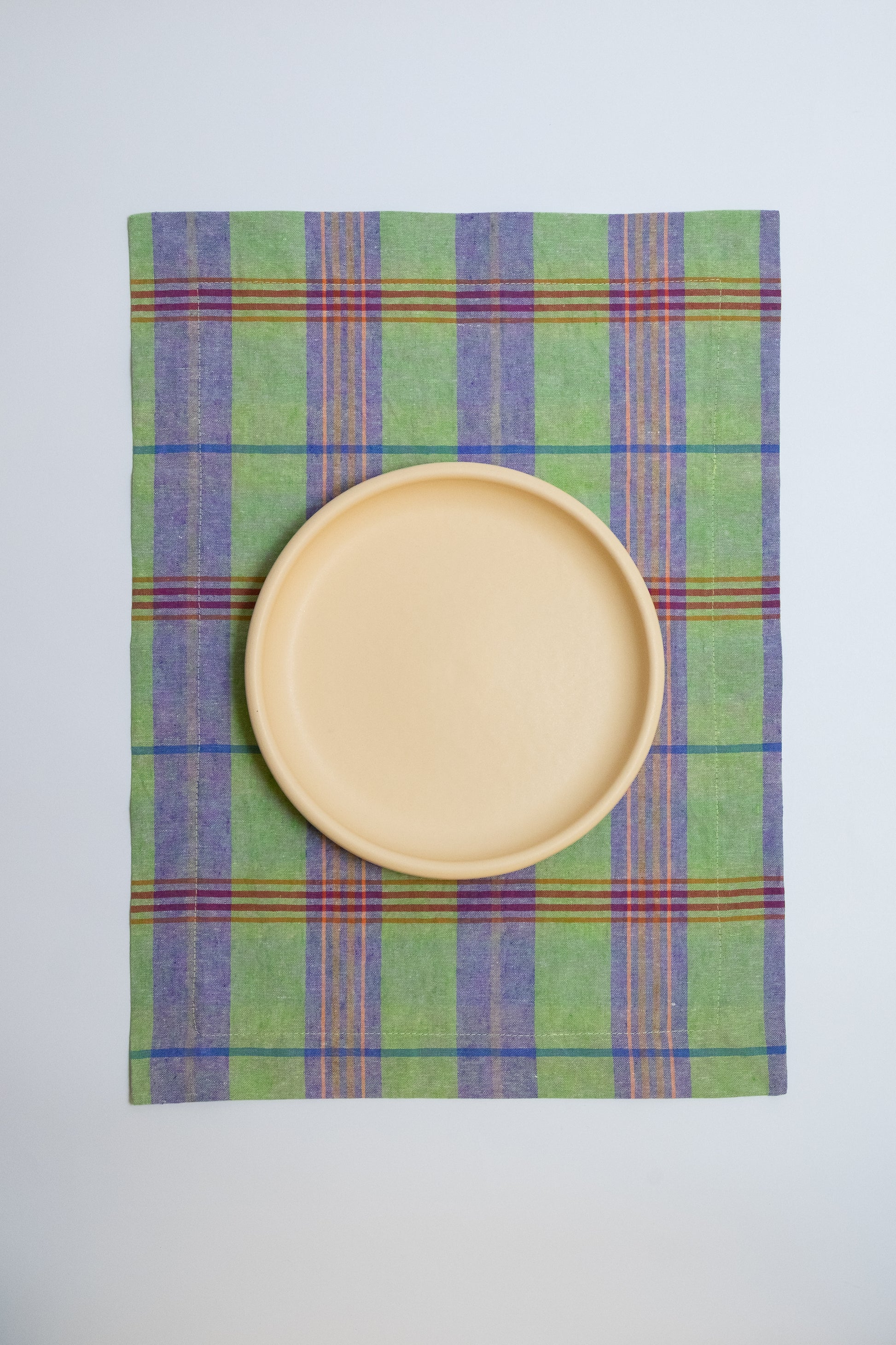 Par de jogo americano confeccionado em tecido xadrez pré-lavado, com composição de 45% algodão e 55% linho.