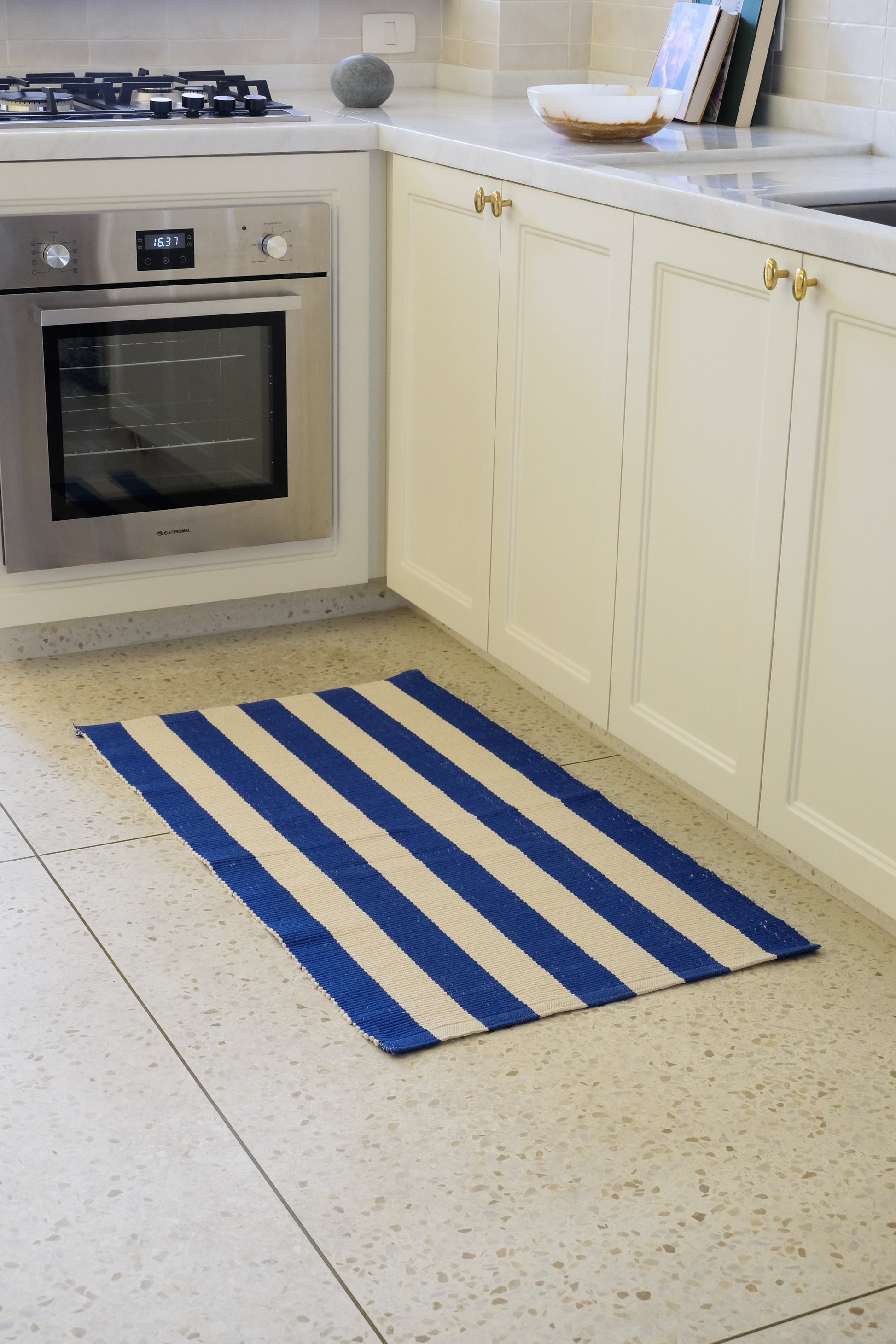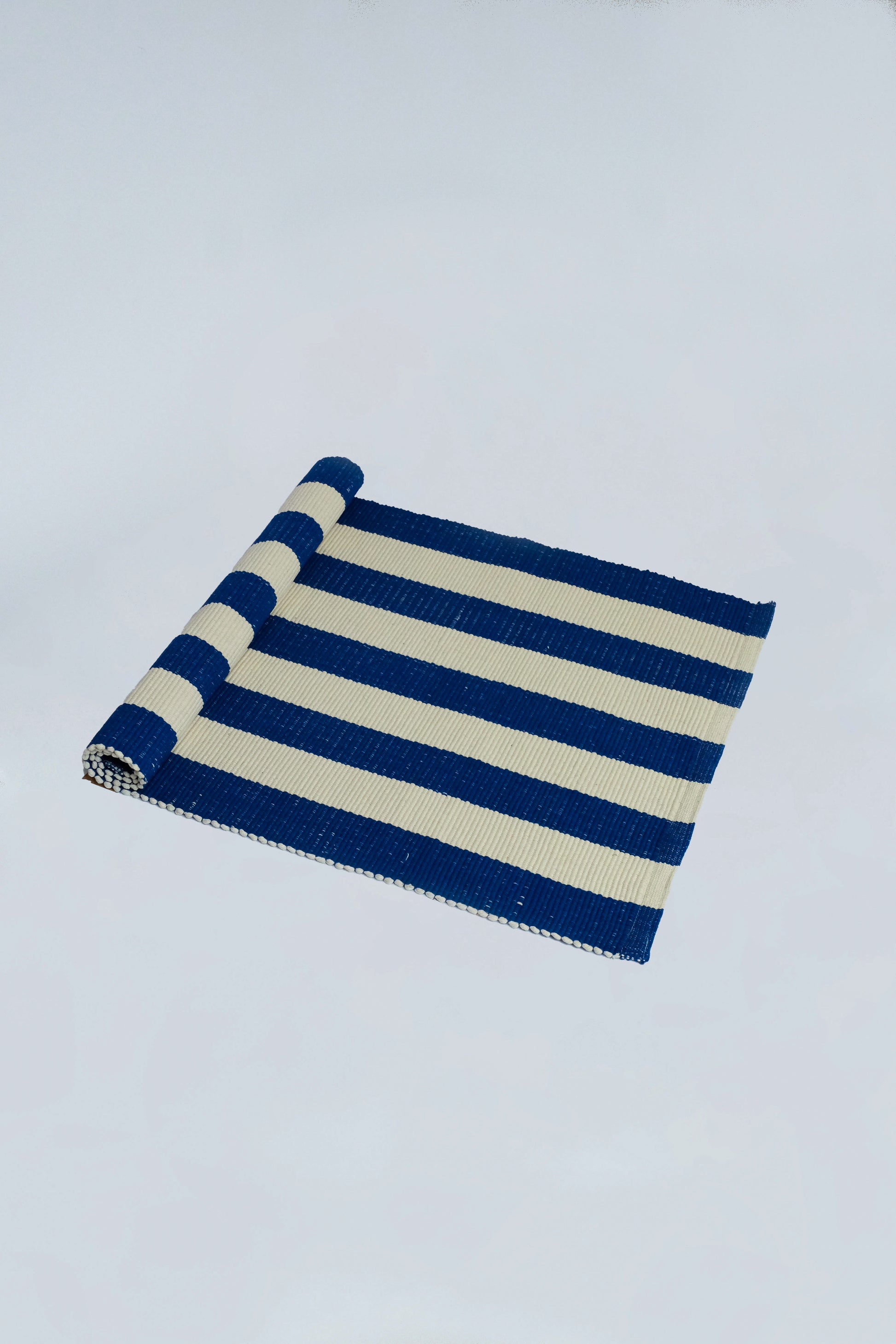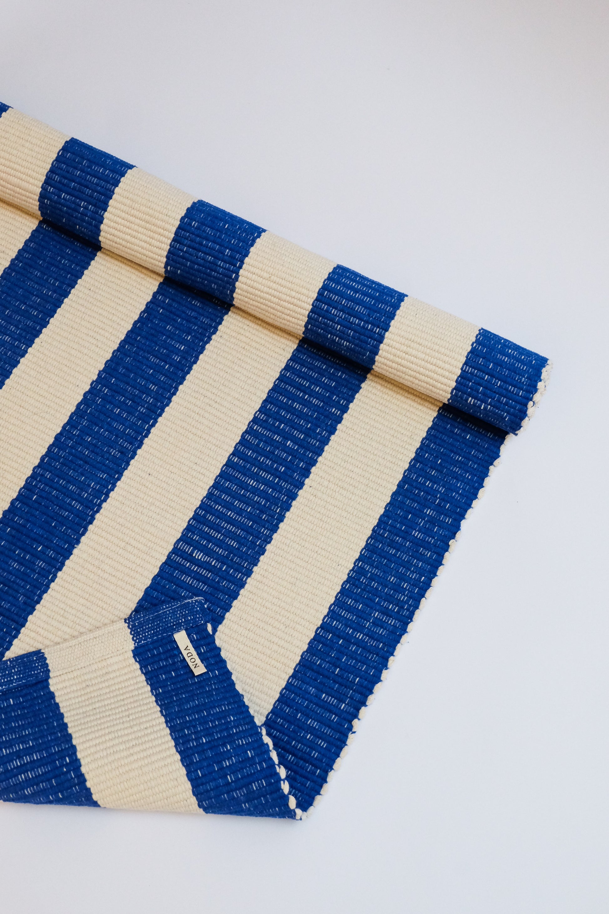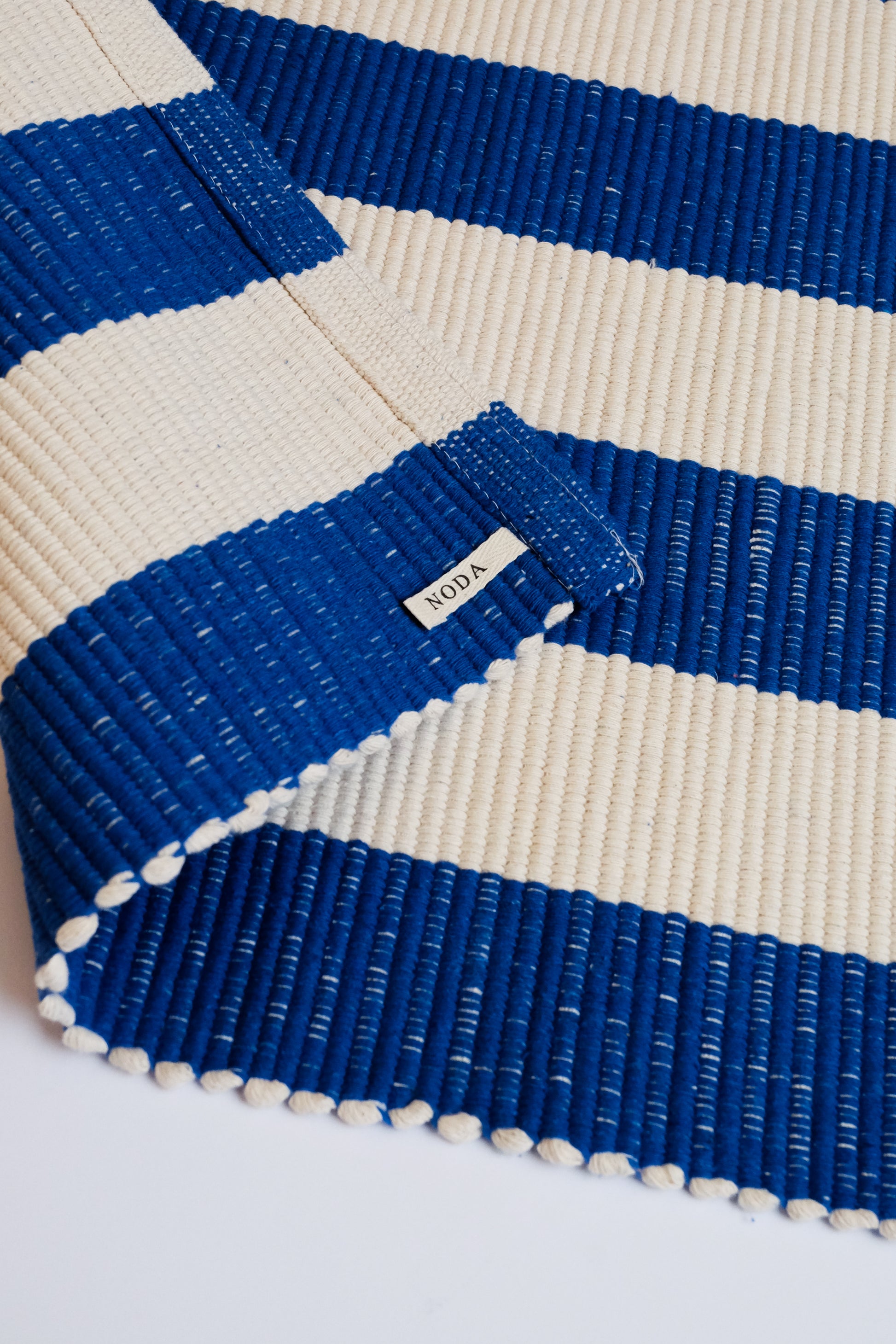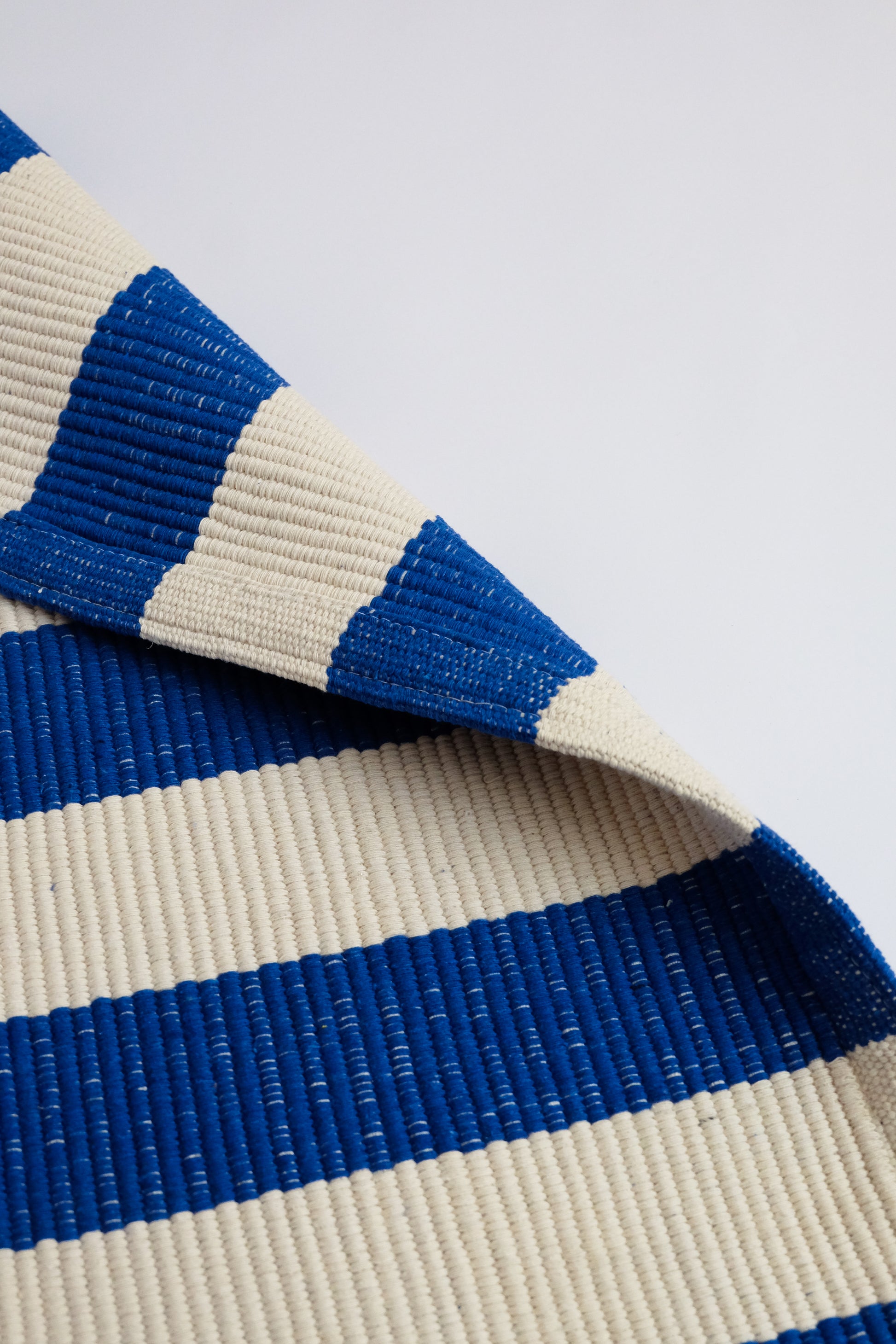 Tapete 100% algodão listrado nas cores cru e azul klein, feitos em tear manual em Pernambuco.
