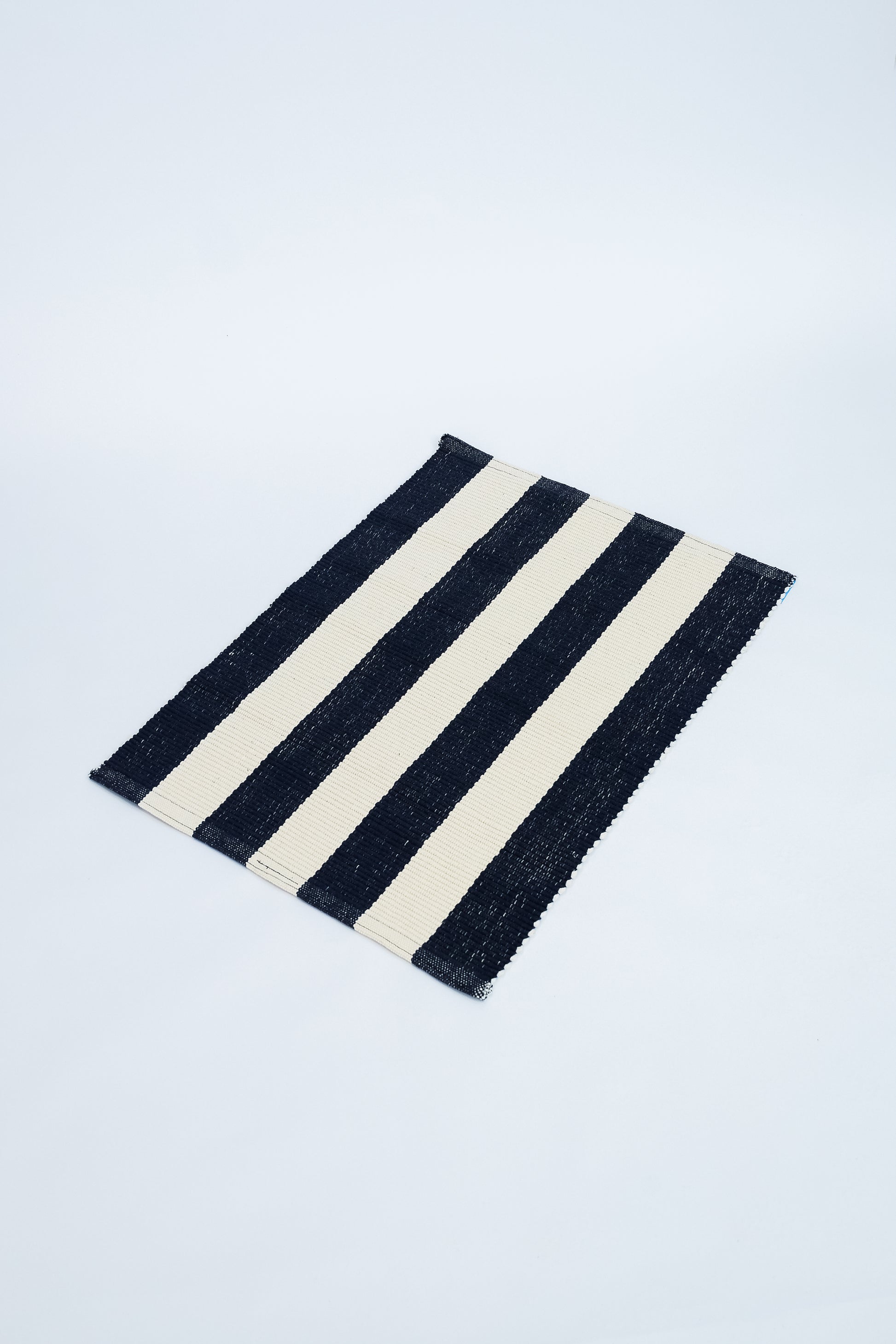 Tapete 100% algodão listrado nas cores cru e azul marinho, feito em tear manual em Pernambuco.