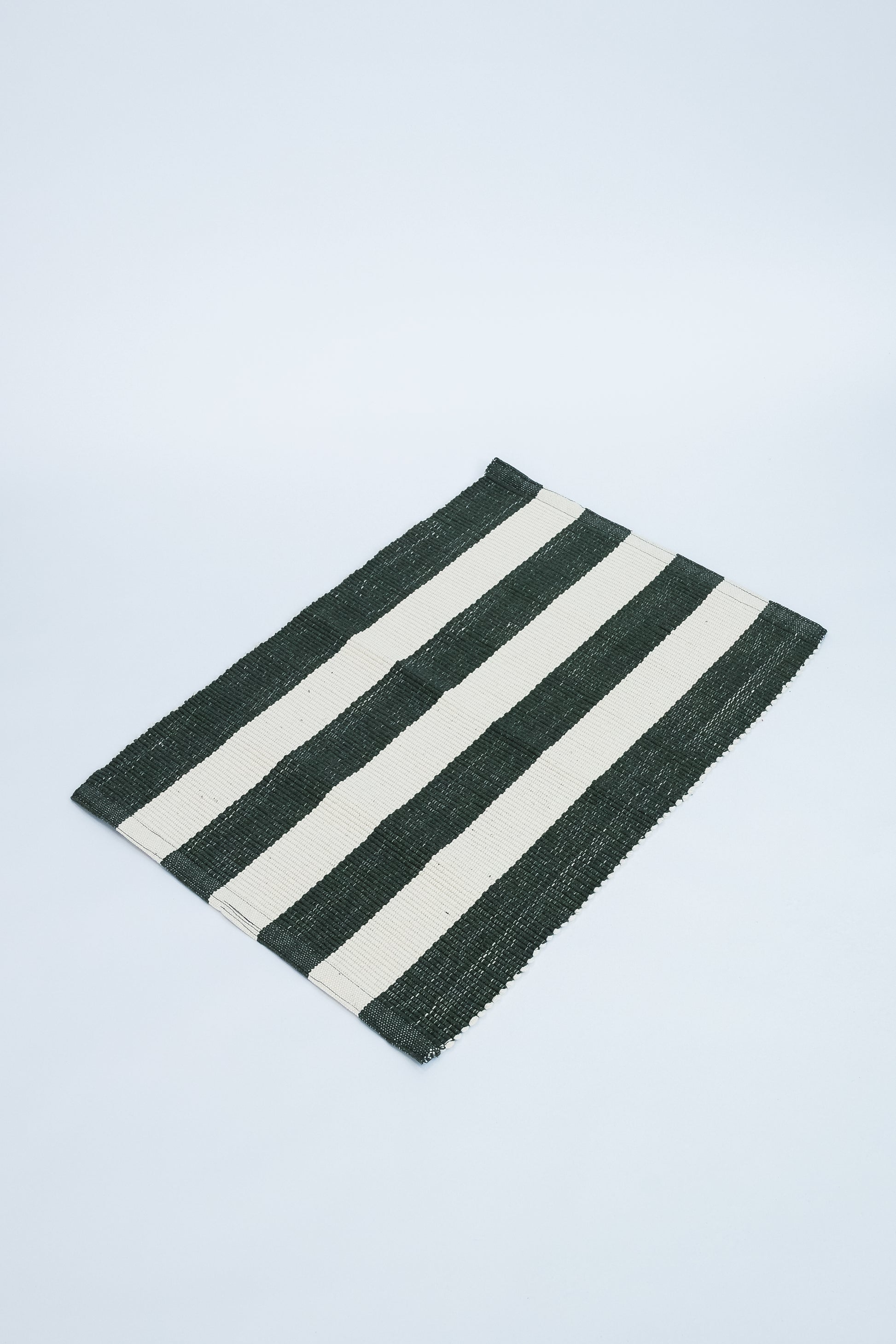 Tapete 100% algodão listrado nas cores cru e verde, feito em tear manual em Pernambuco.