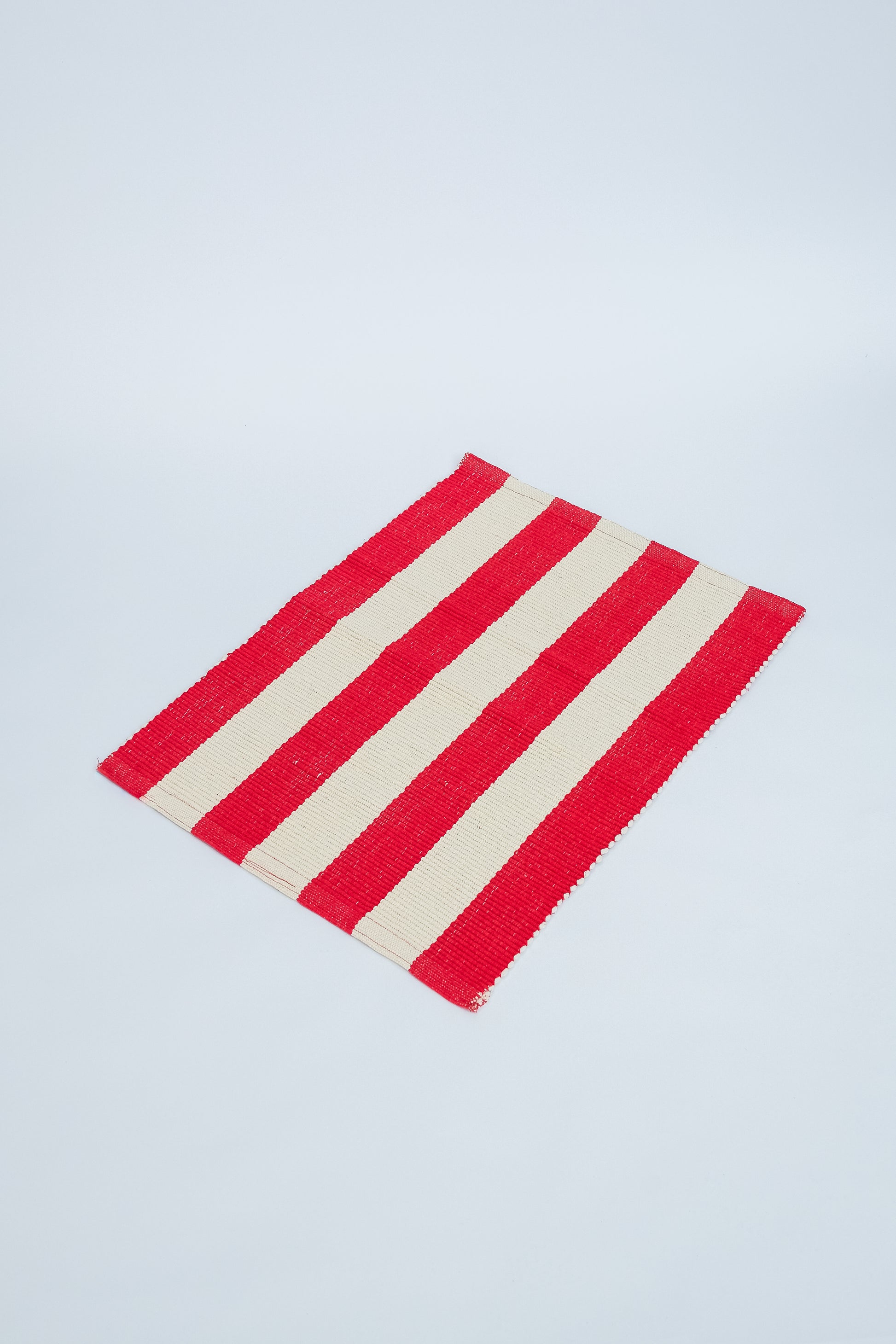 Tapete 100% algodão listrado nas cores cru e vermelho, feito em tear manual em Pernambuco.