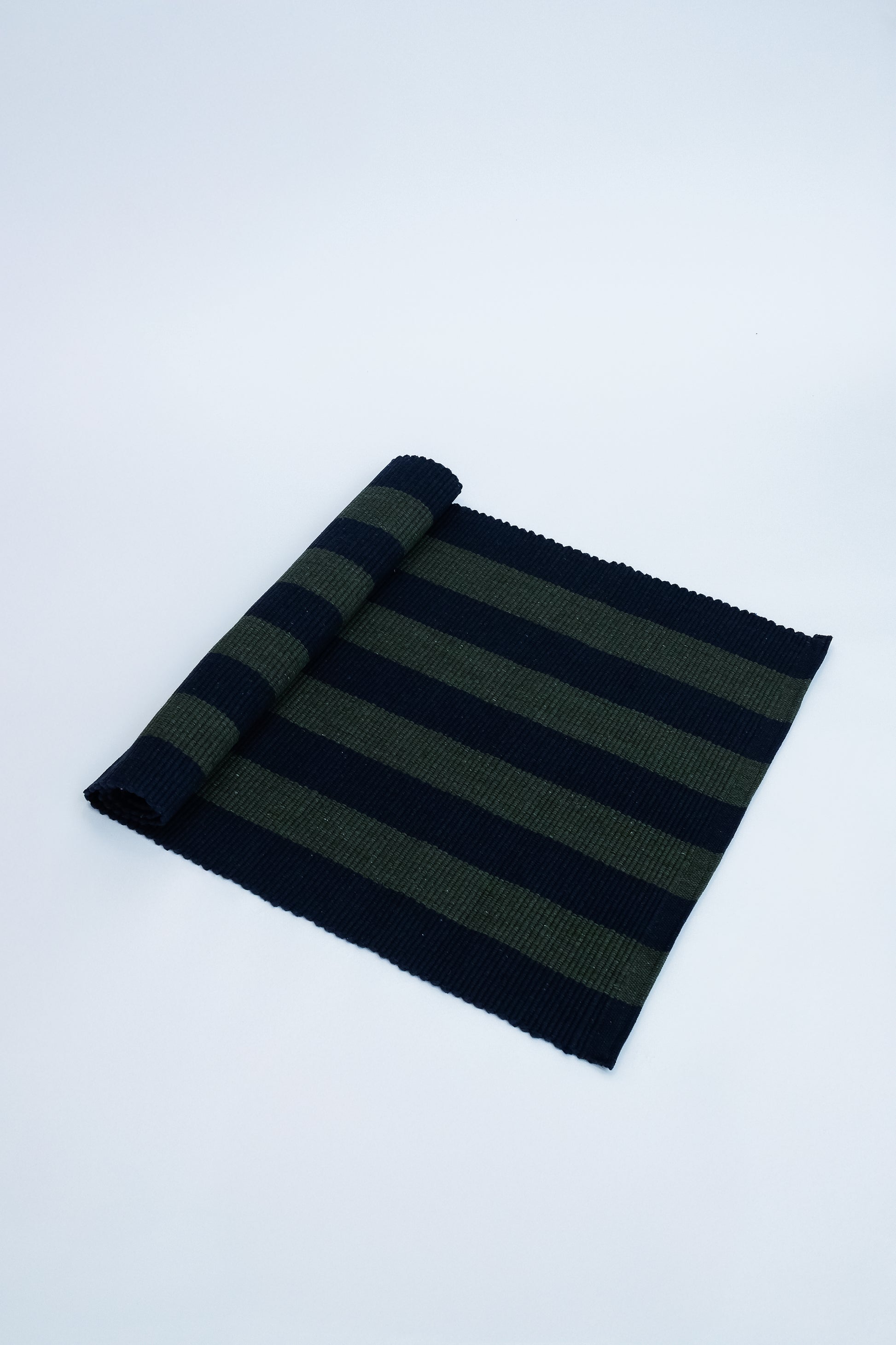 Tapete 100% algodão listrado nas cores verde e azul marinho, feitos em tear manual em Pernambuco.